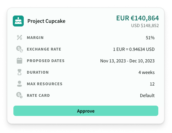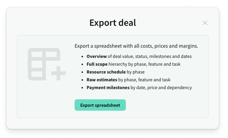 Export deal spreadsheets with a full commercial breakdown of every estimate - cost, price, margin, timeline and resourcing.