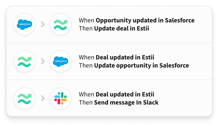 The Estii Salesforce integration supercharges your existing sales workflow with bidirectional updates and automatic attachments to ensure Salesforce remains your single source of truth.