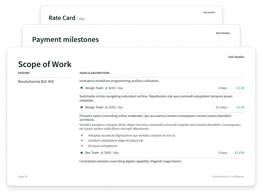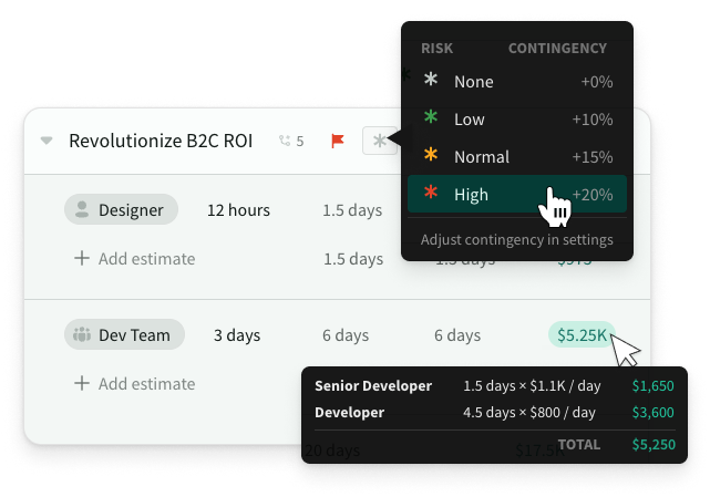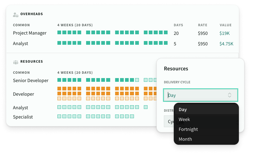 Automatically calculate project timelines and resourcing based on your scope and capacity. Import original estimates into your delivery platforms to easily measure estimated vs actuals.
