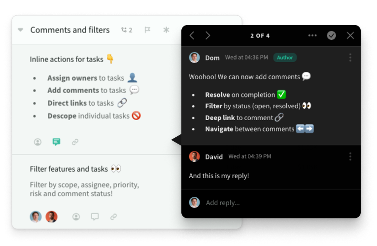 Structure project scope with priorities, risks, filtering and formatting that aligns to how you already work. Give faster, more effective feedback and approval with task owners and inline comments.