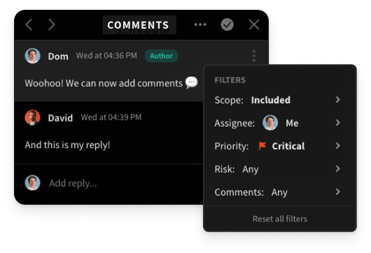 Fast-track teamwork with real-time collaboration, inline comments and filters that enable you to tag owners, link tasks, action items, and more.